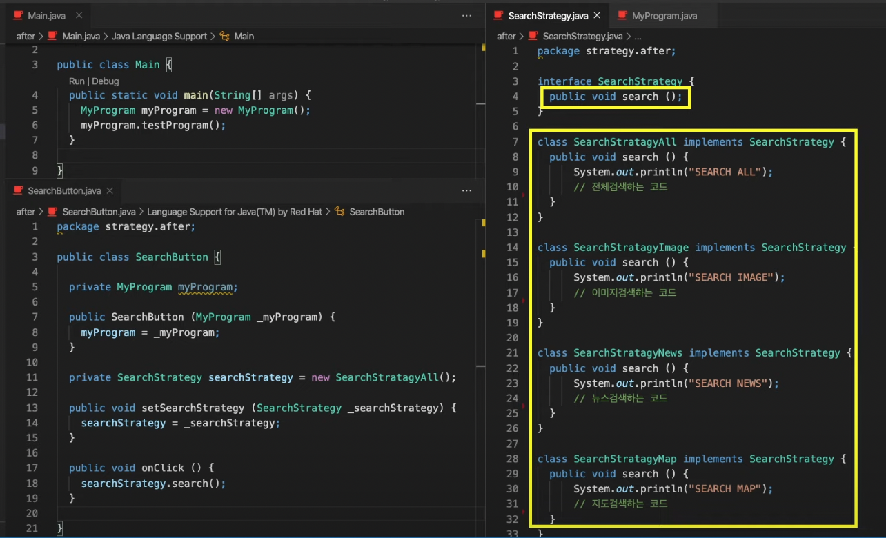 -> searchStrategy의 타입에 따라 search메서드 실행이 달라진다.