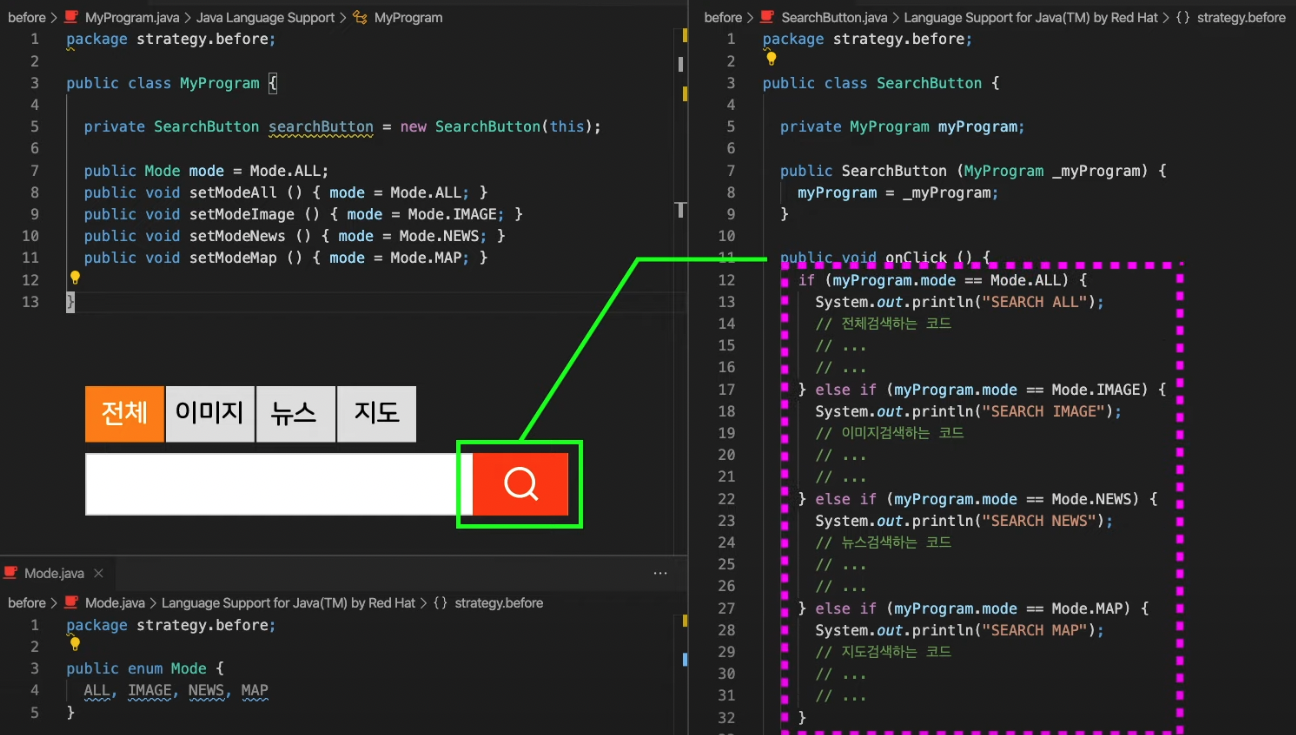 -> 해당코드의 단점은 SearchButton의 onClick메서드를 버튼의 변경사항이 생길 때마다 수정해줘야 함