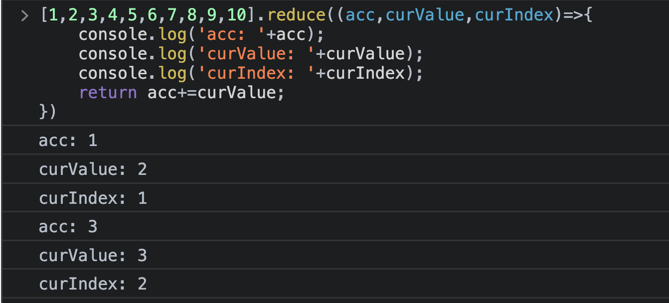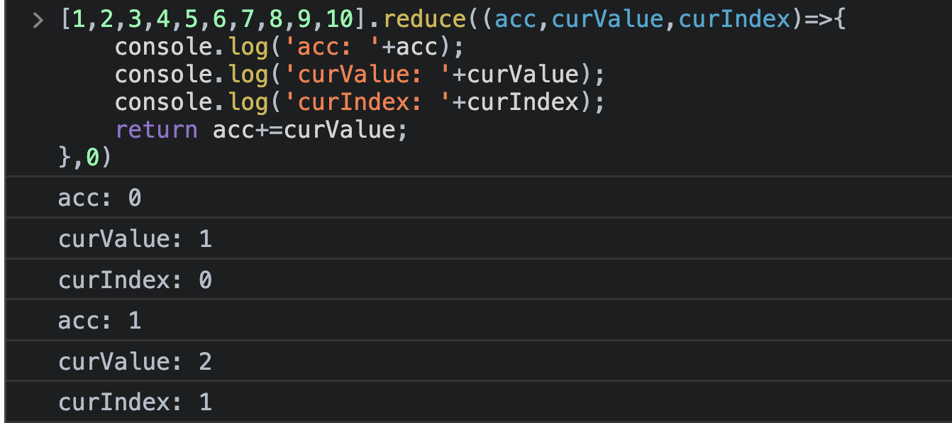 맨 처음 acc 값을 보면 0 즉 initialValue 값으로 제공된 0의 값으로 초기화된 것을 볼 수 있다.