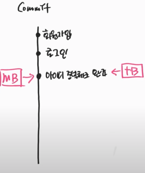 ->main브랜치포인터가 로그인을 가리키고 있다 , t브랜치 포인터가 아이디 중복완료를 커밋하고 main브랜치가 글쓰기를 만들때 이때 실제 브랜치가 생성된다.