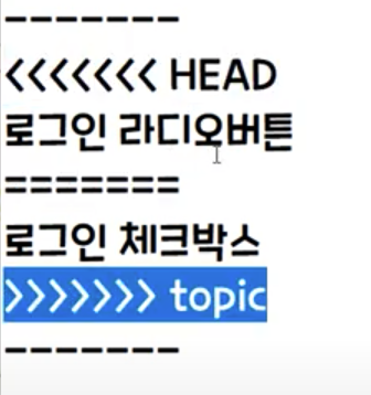 -> 위의그림을 설명하자면 로그인에서 마스터 브랜치와 T브랜치가 위치하다가, 마스터 브랜치에서 로그인파일을 수정하고 , T브랜치에서도 깉은 파일을 수정후, 마스터 브랜치로 merge할 경우, 같은 파일을 수정했기 때문에 충돌이 발생할 수 있다. (이때 merge 는 3way merge)