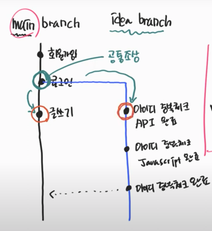 (idea 브랜치에는 로그인 &회원가입에 대한 히스토리가 있고 로그인이 main브랜치와 idea브랜치의 공통조상이라 한다.)
