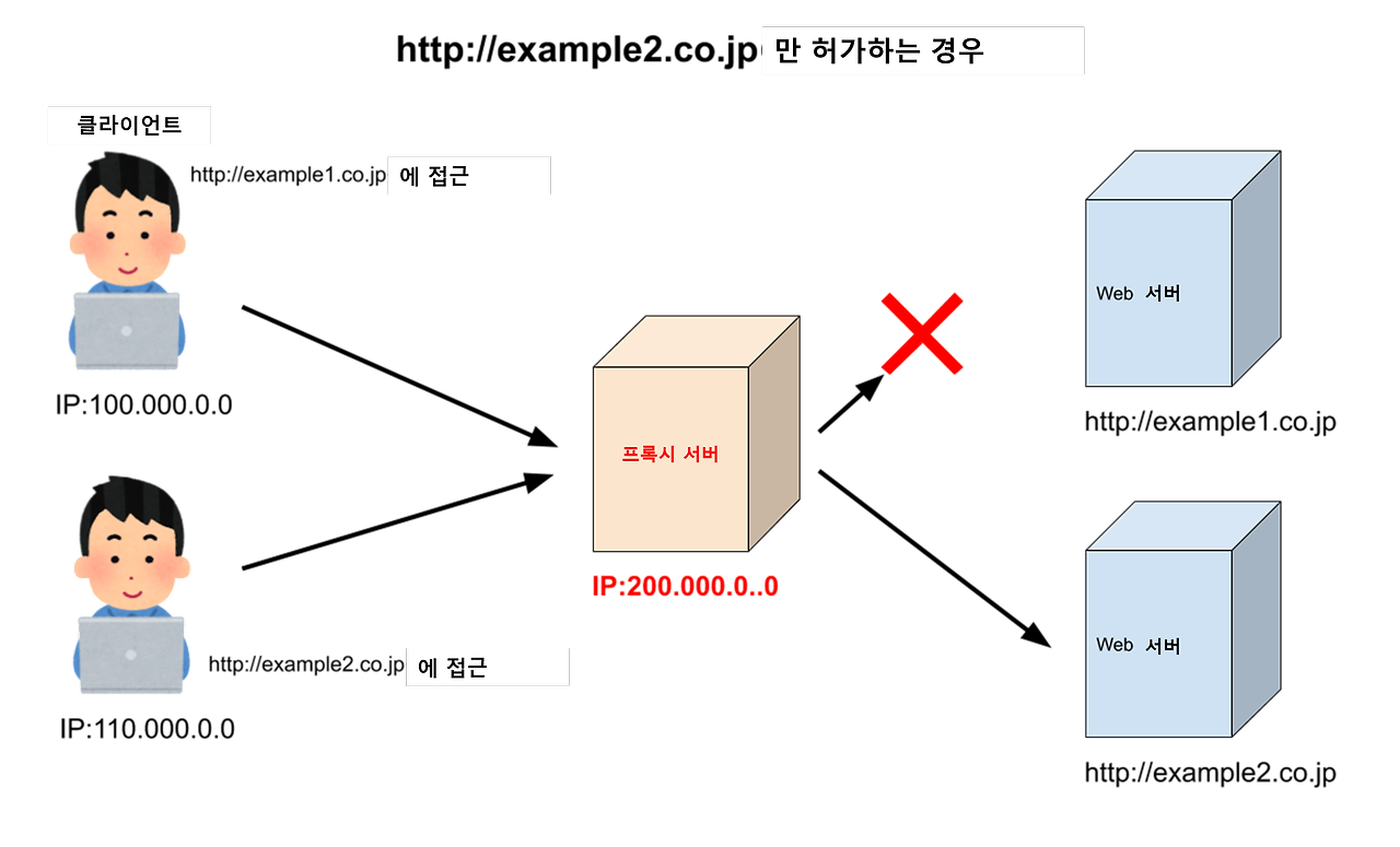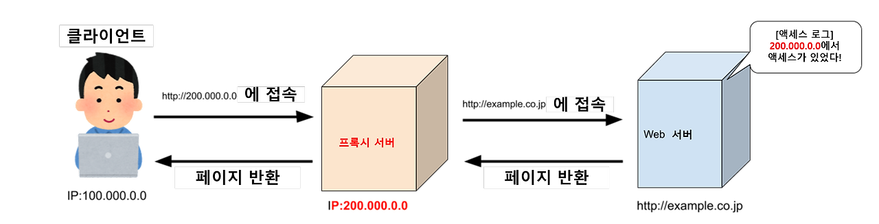 - 클라이언트 대신 프록시 서버가 목적 서버에 통신을 해주는 구성