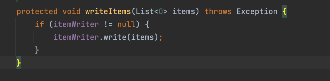 👉 위에서 본 것처럼 ChunkProvide.provide() 메서드가 끝나고 ChunkProcess.process() 안에서 ItemProcessor 이 실행되는 것을 볼 수 있습니다. 즉 ItemReader에서 item 를 chunk 수만큼 읽어오고, ItemProcessor 로직이 실행되게 됩니다. - ItemReader 에서 읽어온 것을 ItemWriter로 넘길 때 어떻게 한 번에 넘겨야 될지 방법에 대한 고민