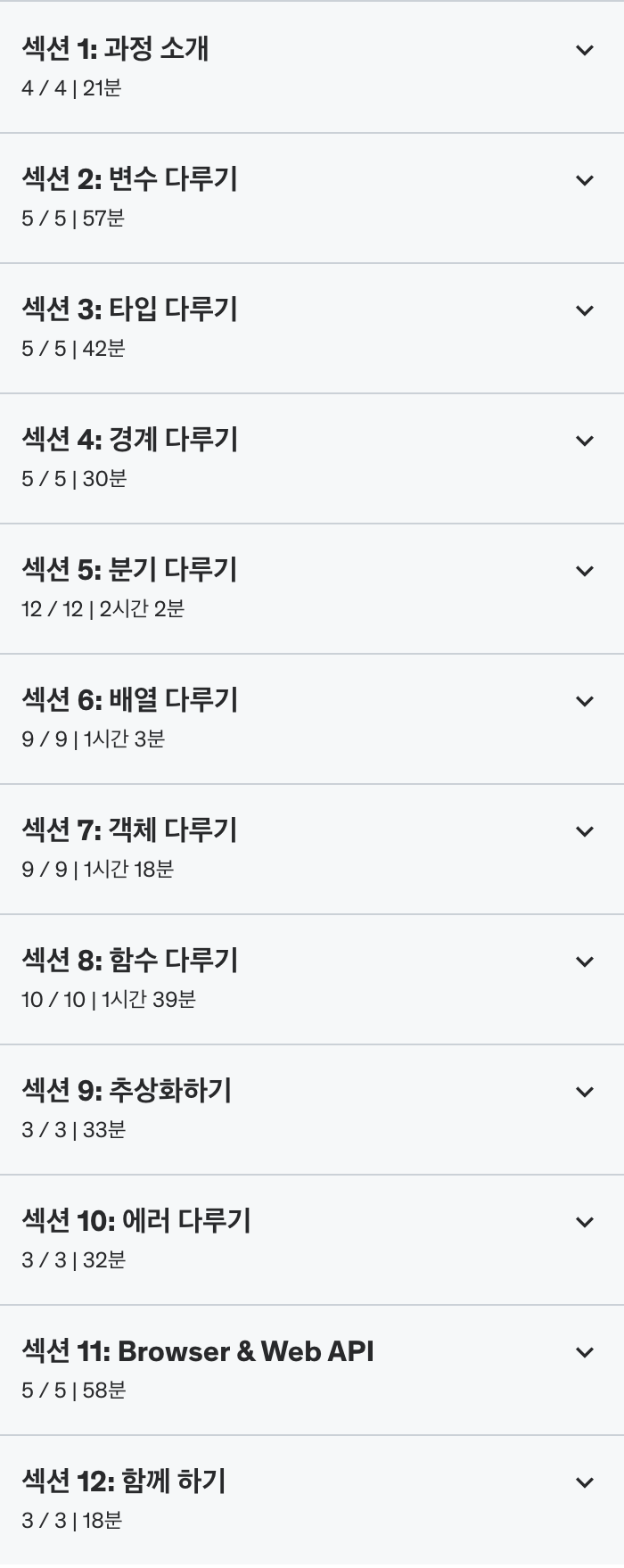 위 사진처럼 강의는 총 12개의 섹션으로 이루어져있습니다. 강의자료는 따로 제공되지 않습니다.